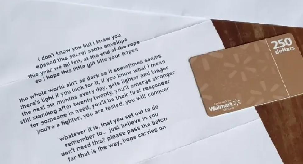 Una de tantas personas afortunadas, fue Elisha Tennant, quien fuera de su casa encontró un sobre que decía “Secret Santa” (Santa Secreto) y al interior halló la tarjeta para comprar en Walmart y un poema sobre esperanza en tiempos difíciles. La mujer lloró apenas abrió el sobre.