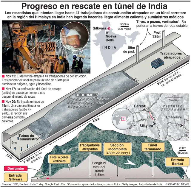 Las autoridades estiman en unos 60 metros el grosor del manto de escombros que dejó atrapados a los obreros la madrugada del 12 de noviembre en el túnel en construcción de Silkyara, en el estado norteño de Uttarakhand, después de que uno de sus tramos se derrumbase.