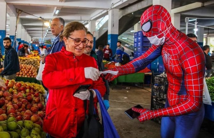 En Turquía, Burak Soylu, un ‘cosplayer’ que personifica al Hombre Araña en la ciudad turca de Antalya, ayuda a las personas mayores, llevándoles alimentos y otras compras necesarias para que puedan quedarse en domicilios, durante la pandemia de coronavirus.