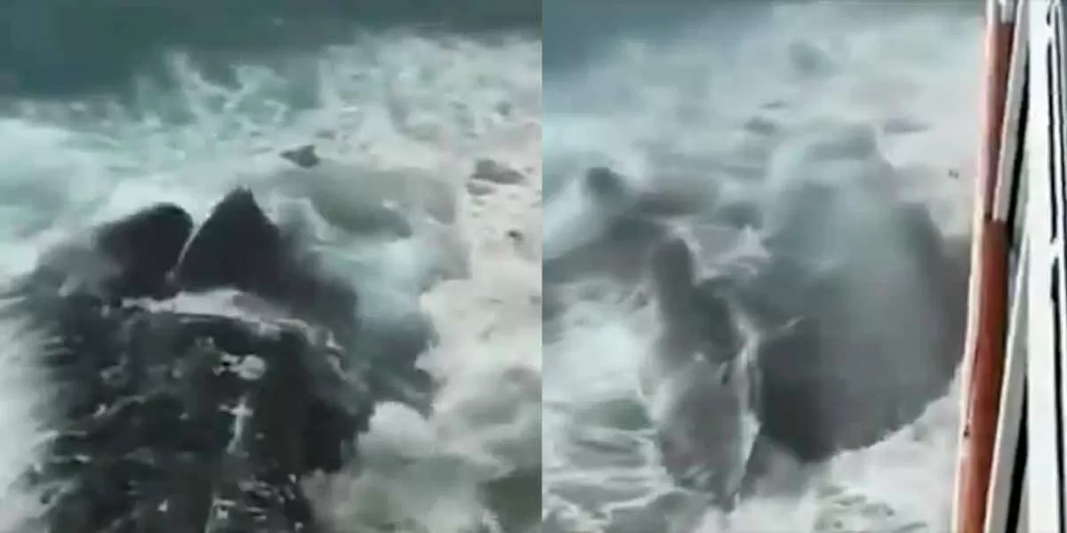 En las imágenes se observa como otras personas a bordo del navío, se asoman y tratan de descifrar de qué se trata, es entonces, cuando al enfocar el extraño fenómeno, parece ser un animal de proporciones colosales, con escamas y que provoca mucho movimiento, como una enorme ballena que nada por el lugar, aunque, incluso se percibe casi del tamaño del barco.