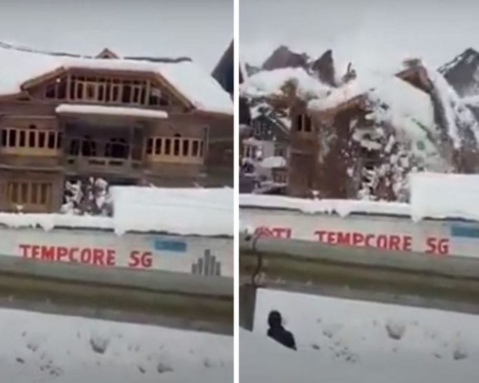 India.- Una persona logró captar el momento en el que colapsa el tejado de una vivienda de 3 pisos en la India por la cantidad de nieve que acumuló.