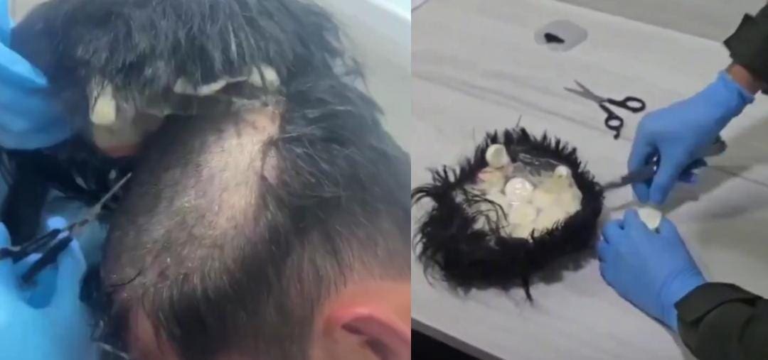 Gracias al uso de unas tijeras lograron separar la peluca del cuero cabelludo y, en medio, se encontraron con el cargamento que pretendía transportar hasta Países Bajos para vender hasta por un valor cercano a los 10 mil euros, poco más de 200 mil pesos mexicanos.