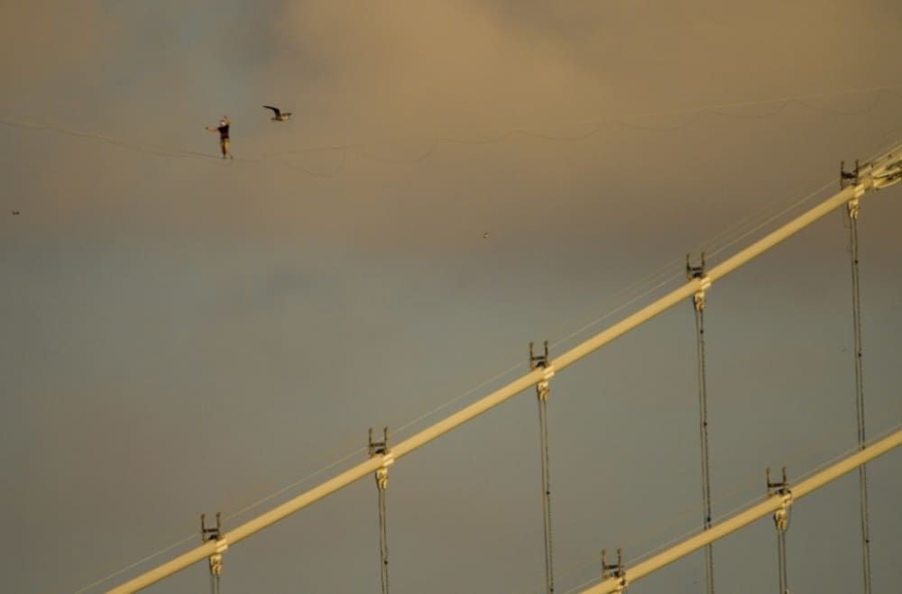 El equilibrista estonio Jaan Roose, caminó por una cuerda floja ubicada a 165 metros de altura, desde el continente asiático hasta el europeo en Estambul, Turquía.