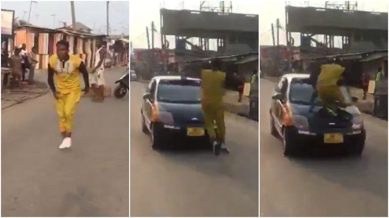 El video captura el momento exacto en que el hombre comienza a correr junto a un vehículo en movimiento, con la intención de realizar un salto impresionante. Sin embargo, el cálculo del salto falla, y el hombre acaba estrellándose contra el parabrisas del vehículo antes de caer al suelo de manera abrupta.