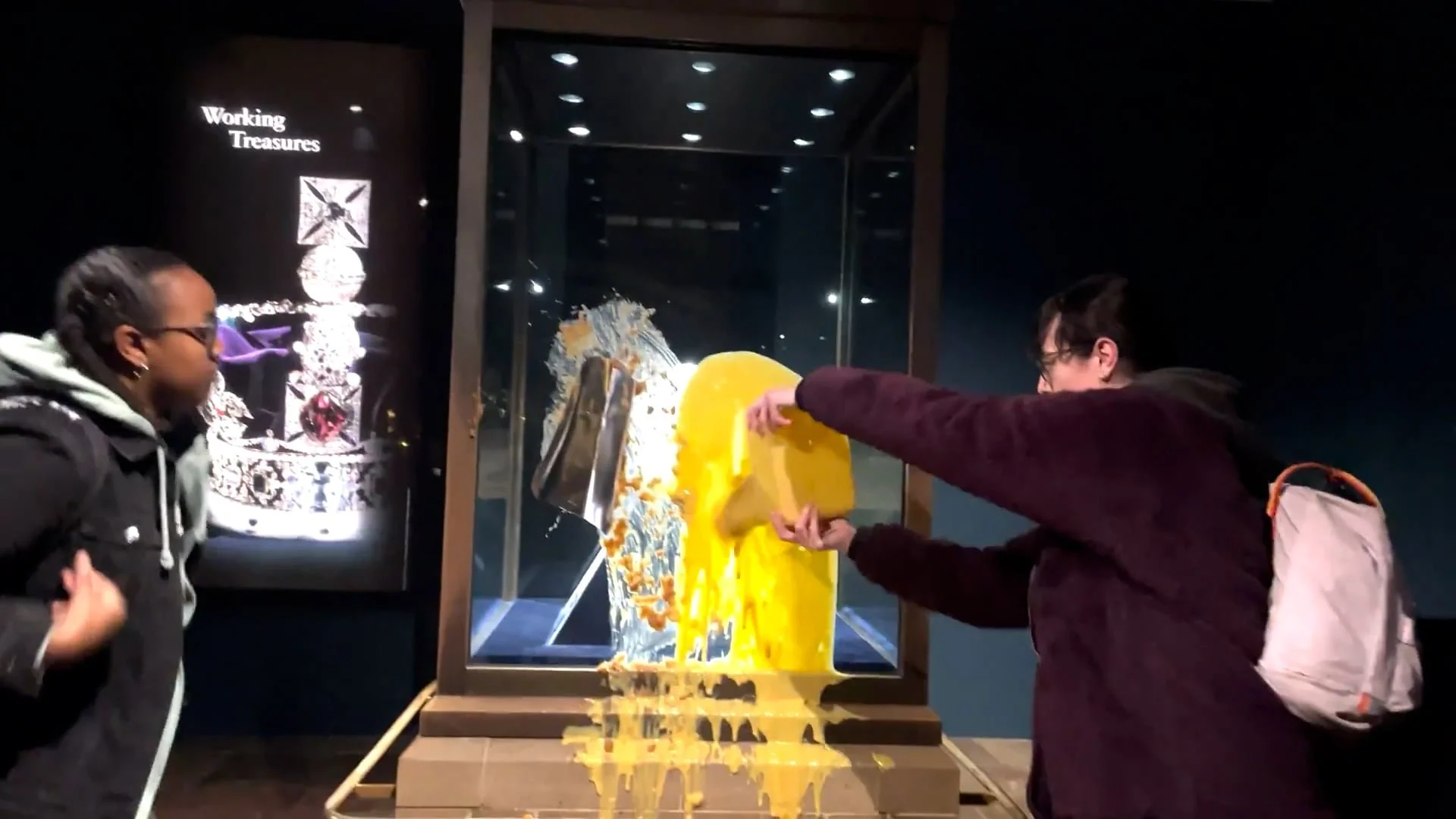 Manifestantes del colectivo “Take Back Power” lanzaron comida contra la vitrina que resguarda la Corona Imperial del Estado en la torre de Londres, lo que provocó su detención inmediata y el cierre temporal del histórico recinto para investigaciones.