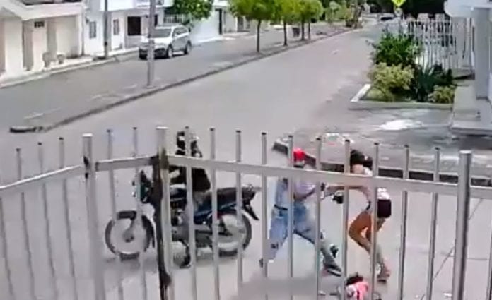 Los hechos ocurrieron en Montería, Colombia, y una cámara fue la que captó el momento en que la joven madre y su hija caminan tranquilamente cuando un par de asaltantes las rodean, uno de ellos se baja para robarle el celular y esta no se deja.