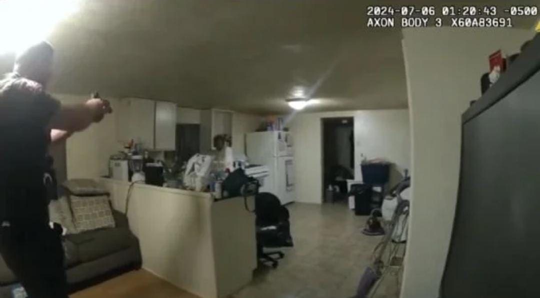 Tal como las imágenes dejan apreciar, el polícia detenido y otro agente más conversan de forma tranquila en el interior de la vivienda con Sonya Massey, la víctima de 36 años, hasta que comienza una breve discusión en torno a una olla de agua hirviendo en la estufa.