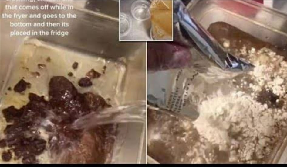 Para empezar, la base de este producto es una pasta de color marrón hecha con los resto de pollo que quedan en la freidora tras cocinar la carne, según explica el tiktoker en su video.