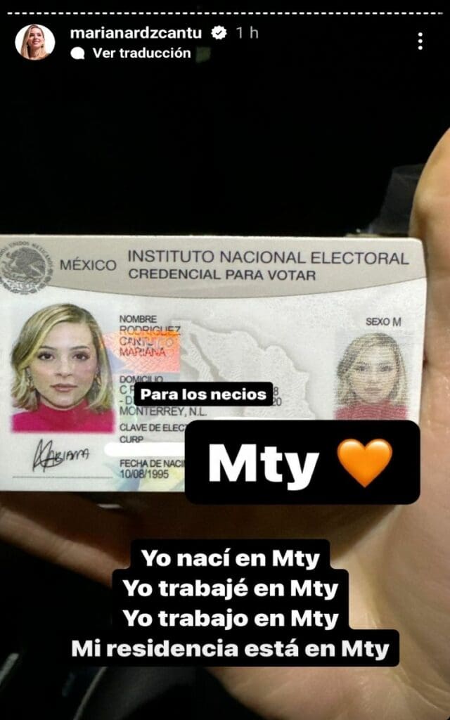 La titular de AMAR a Nuevo León publicó en sus historias de Instagram su credencial de elector para demostrar que su domicilio se encuentra en el municipio en el que busca ser alcaldesa.
