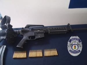 Una vez que la unida fue detenida y revisada se localizaron un arma de fuego tipo fusil con dos cargadores con 53 cartuchos 5.56 mm, algunos teléfonos celulares, dos portaplaca de color negro con cadena, como los que usan elementos de seguridad; además se halló un arma de fuego con un cargador con 46 cartuchos útiles calibre 5.7 x 28, otra arma de fuego con un cargador con 30 cartuchos calibre 5.56, un arma de fuego tipo fusil con un cargador abastecido.
