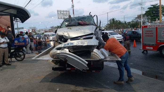 Cancún.- El conductor de una camioneta se estrelló en contra del muro de un Domino’s Pizza, esta tarde, aunque no sin antes arrollar a una hilera de motocicletas de la empresa, hiriendo así a dos repartidores.
