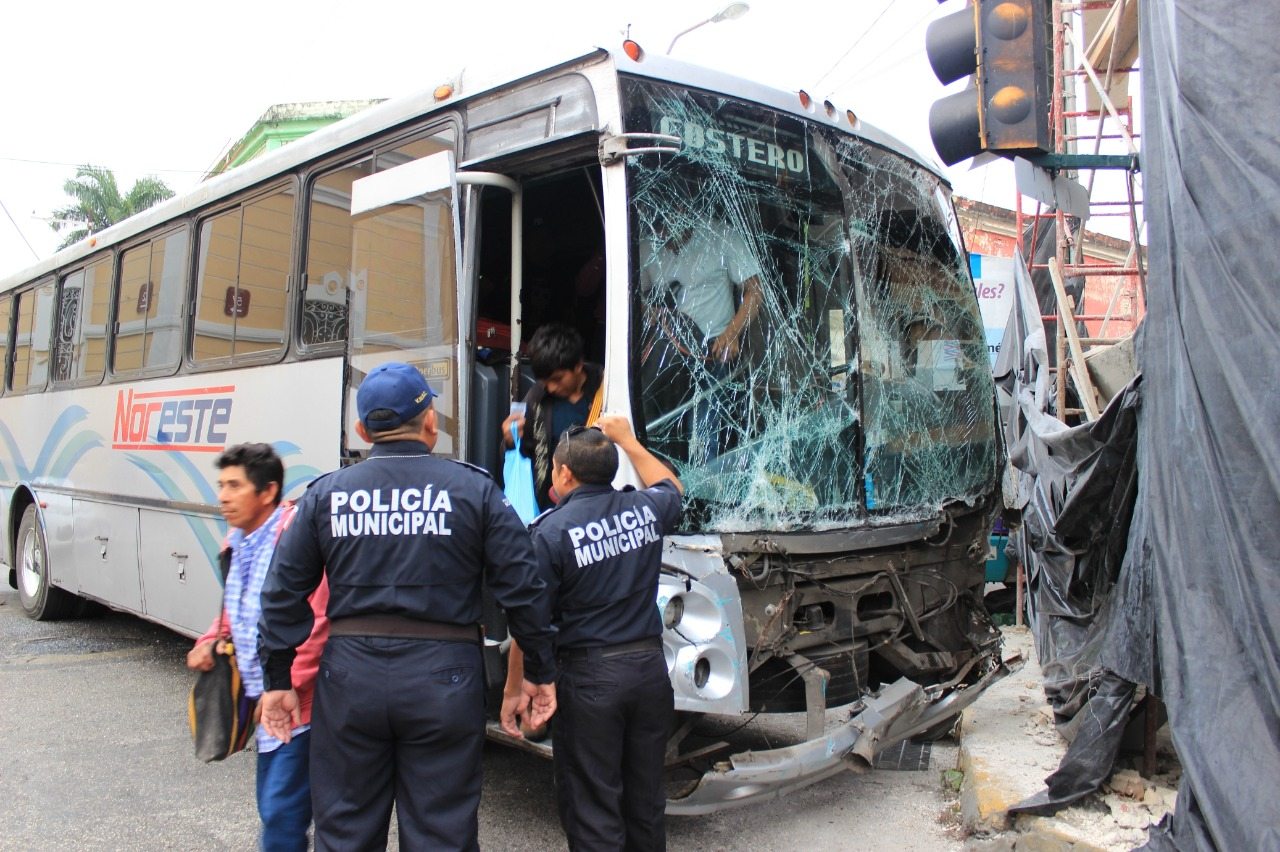 Mérida, Yucatán.- Dos autobuses de transporte público se estrellaron esta mañana en el cruce de las calles 57 y 52, dejando a 12 personas con diversos golpes, aunque ninguno que ameritara su traslado al hospital.