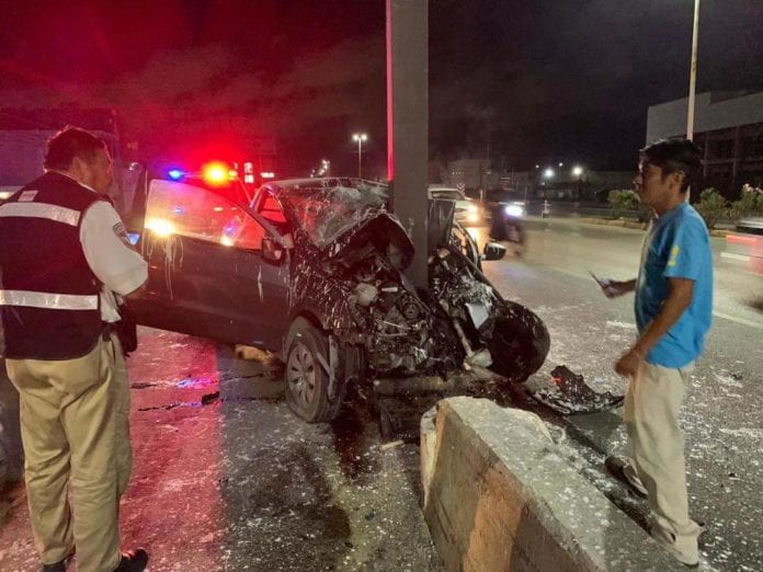 Cancún.- Cerca de las cinco de la mañana, un sujeto que conducía un automóvil en presunto estado de ebriedad se estrelló con la columna de concreto de un túnel a la altura de Alfredo V. Bonfil, lo que le causó la muerte de manera inmediata. Una mujer que lo acompañaba también quedó lesionada de gravedad.