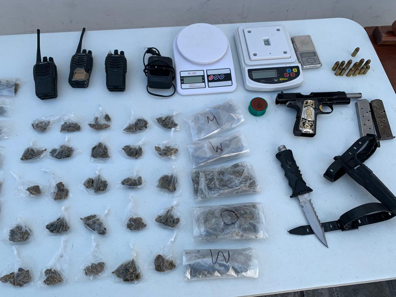 También se aseguró una pistola calibre .45, y otra de 9 mm, un chaleco antibalas, tres radios, tres armas cortopunzantes, 100 dosis de marihuana y tres básculas grameras.