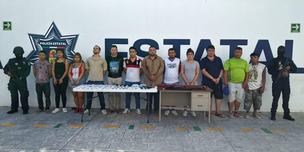Playa del Carmen.- Una presunta célula delictiva fue capturada en su totalidad, incluyendo a su líder, en un operativo realizado por la Policía Estatal en un asentamiento irregular a las afueras de la ciudad. En total, 12 personas fueron detenidas, en posesión de drogas y armas.