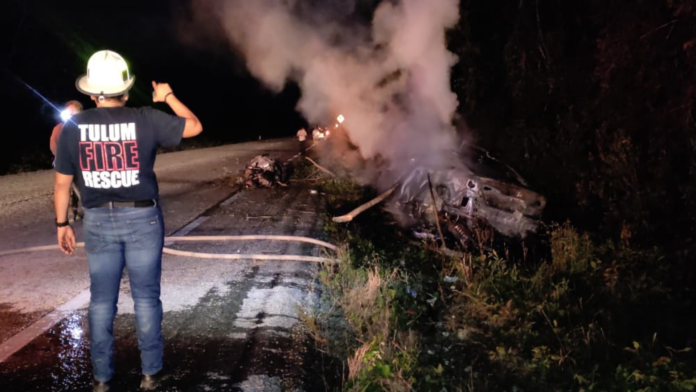 Tulum, MX.- Una persona murió calcinada anoche, luego de estrellarse contra un árbol, a un costado de la carretera federal 307, a la altura de Muyil.