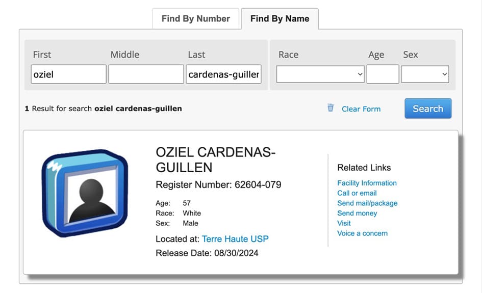 Desde entonces, el detenido ha permanecido bajo custodia federal sin derecho a fianza, con el número de registro 62604-079. En la ficha del BOP, en internet, se describe a Osiel como un hombre de 57 años de edad y de raza blanca.