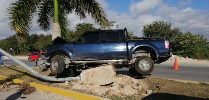 Playa del Carmen.- El conductor de una camioneta tipo pick up patinó con la gravilla suelta en el pavimento y se proyectó en dos ocasiones hacia infraestructura pública, hasta detenerse sobre un poste de luminaria en el Arco Vial.
