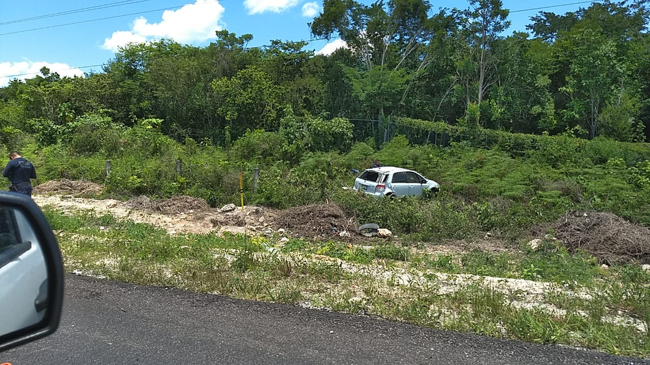 Bacalar.- Un vehículo compacto fue abandonado después de salirse de la carretera federal, a pocos kilómetros del entronque a Miguel Hidalgo, en el municipio de Bacalar.