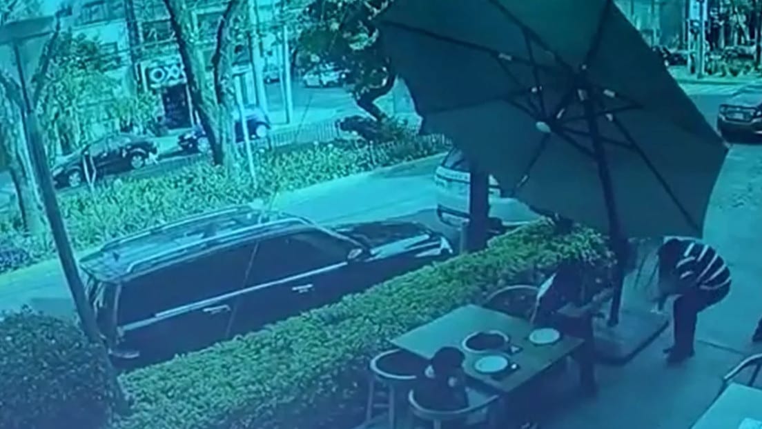 En el video se puede observar cómo dos agresores se acercan a la mesa de una pareja. Según detallan medios locales, unos de los criminales le mostró un arma de fuego al hombre e intentó despojarlo de un teléfono y un reloj, momento en el cual que el individuo sacó un arma y disparó contra los ladrones. Los asaltantes se apresuraron a huir.