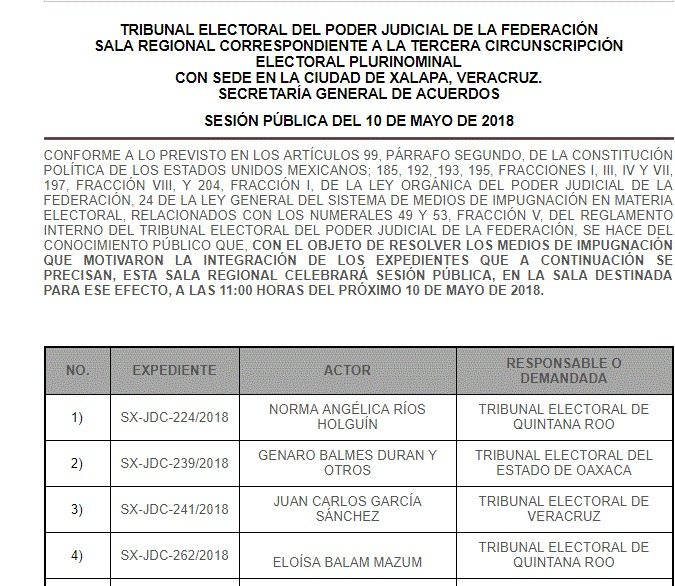 Cancún.- La Sala Regional Xalapa del Tribunal Electoral del Poder Judicial de la Federación (TEPJF) sesionará mañana, jueves, 10 de mayo, y de 31 asuntos a dirimir, 19 tienen que ver con Quintana Roo.