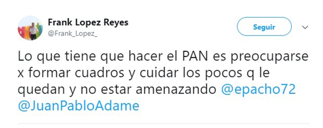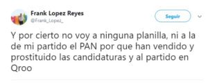 Por medio de su cuenta de Twitter, López Reyes expuso que Eduardo Pacho debe estar tranquilo porque no estará en ninguna lista de regidores o planilla de algún, partido, incluyendo al PAN.
