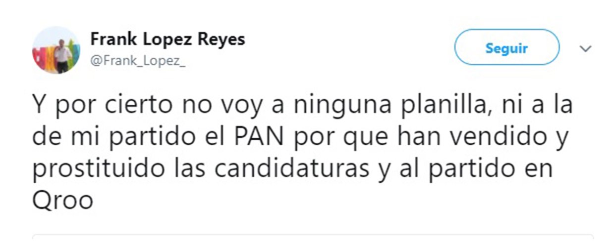 Cancún.- Frank López Reyes afirmó que no se va del Partido Acción Nacional (PAN). El exdirector de Turismo Municipal en Benito Juárez respondió al dirigente municipal de Acción Nacional, Eduardo Pacho, que esta mañana afirmó que Frank López sería expulsado si apareciera en una lista de regidores por parte del Movimiento Regeneración Nacional (Morena).
