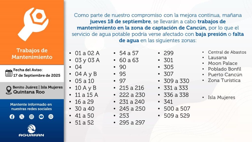 Como parte de su compromiso con la mejora continua, Aguakan informa a la ciudadanía que el próximo jueves 18 de septiembre del 2025 se realizarán trabajos de mantenimiento en la zona de captación de Cancún, lo que ocasionará afectación en el suministro de agua potable en diversas supermanzanas de la ciudad.