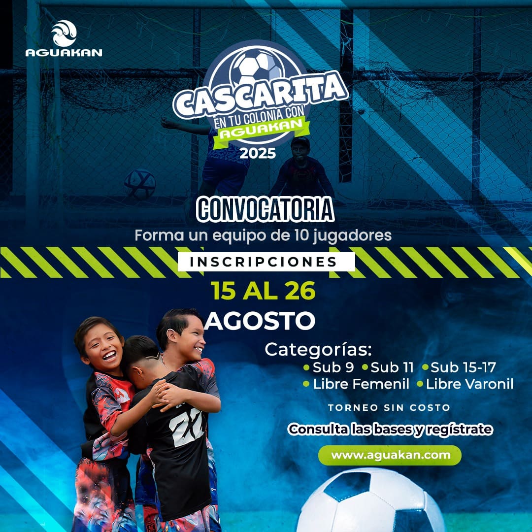 Las inscripciones para “Cascarita en tu colonia” se realizarán del 15 al 26 de agosto a través del sitio web oficial www.aguakan.com. El proyecto busca promover la actividad física y brindar un espacio seguro y divertido para el esparcimiento familiar, reafirmando el compromiso de Aguakan con el desarrollo social de la región.