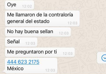 El supuesto empleado usa el número +52 444 623 2175 que es de San Luis Potosí para sus llamadas y pide el domicilio de la persona que labora en cada medio.