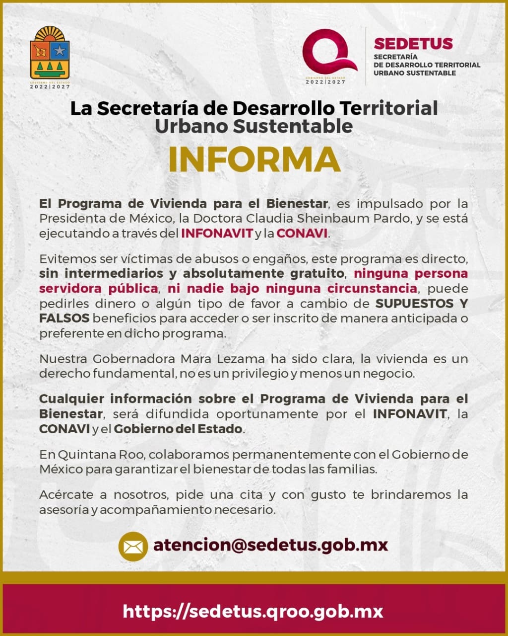 Chetumal, Q. Roo. – La Secretaría de Desarrollo Territorial Urbano Sustentable (SEDETUS) lanzó una advertencia a la ciudadanía sobre posibles fraudes relacionados con el Programa de Vivienda para el Bienestar, que actualmente se impulsa a nivel nacional por la presidenta Claudia Sheinbaum, y se ejecuta a través del INFONAVIT y la CONAVI.