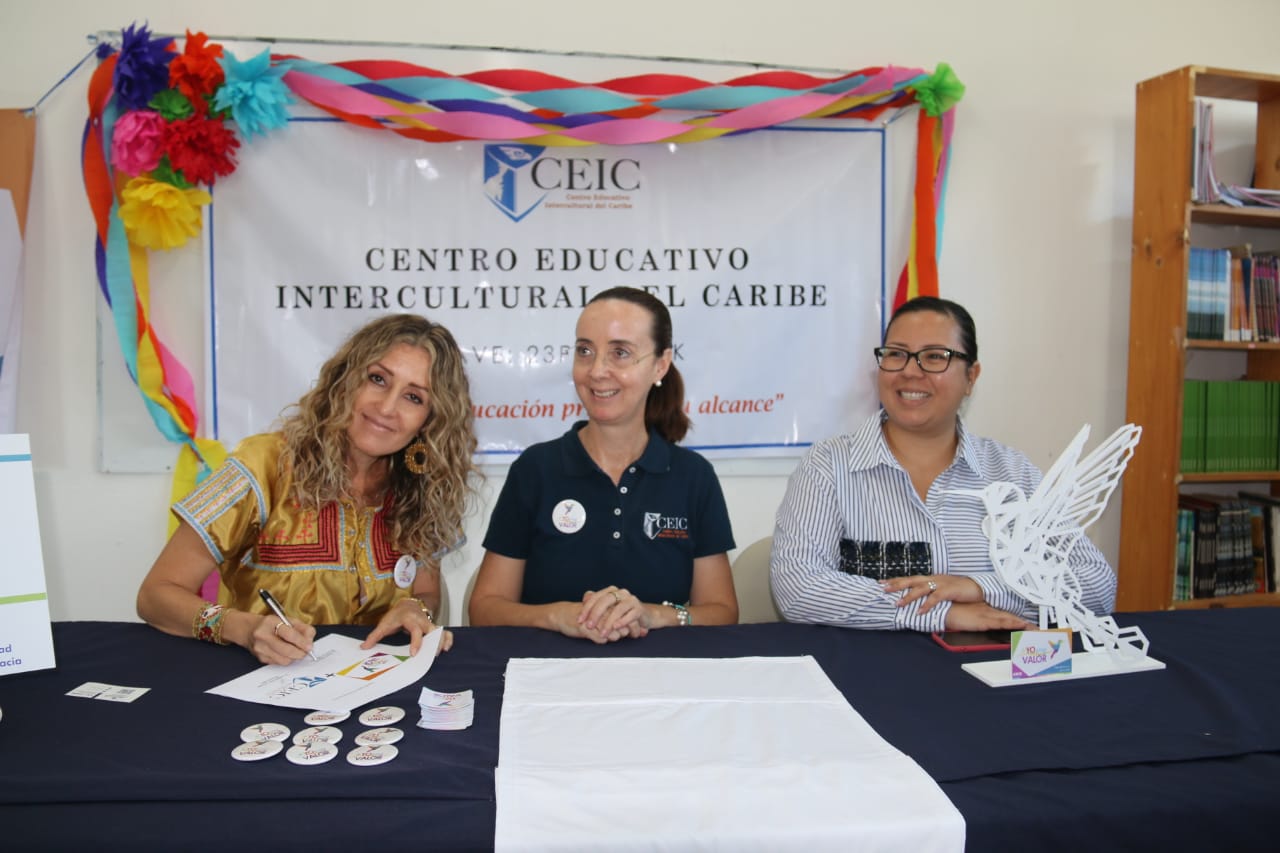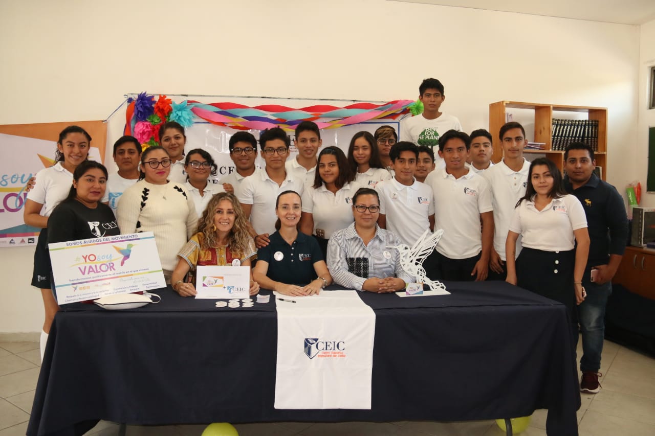 Playa del Carmen, Quintana Roo.- Esta tarde el movimiento #YoSoyValor de la Asociación Mexicana de Mujeres Empresarias, Capítulo Riviera Maya, firmó convenio en la sede de la preparatoria del Centro Educativo Intercultural del Caribe, acompañada de los alumnos y autoridades presentes del establecimiento.