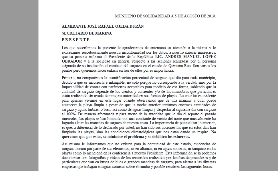 Playa del Carmen.- Empresarias y activistas locales elaboraron una carta que enviarán al titular de la Secretaría de la Marina, el Almirante José Rafael Ojeda Durán, para exigir que se informe la metodología utilizada para determinar que ya tuvieron éxito en el combate al sargazo y que, principalmente, se permita a expertos y empresas locales a participar en esta tarea, luego de ser desplazados por decisión del ejecutivo Federal.