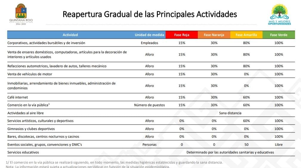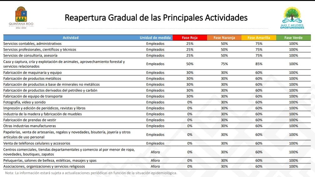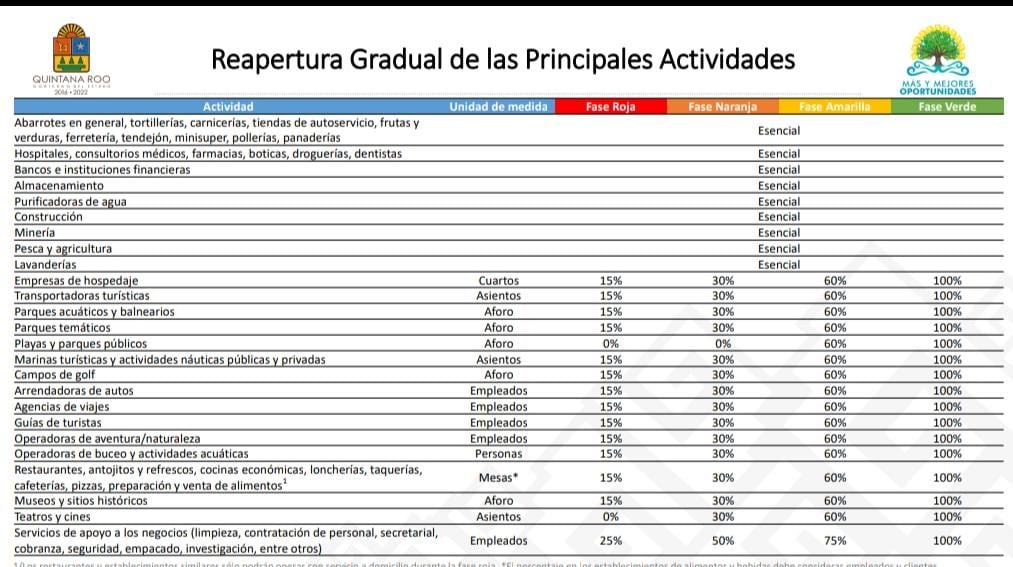 En tanto, para Lázaro Cárdenas, Isla Mujeres, Benito Juárez, Puerto Morelos, Solidaridad, Cozumel y Tulum, estas últimas actividades ya podrán realizarse, pero en un aforo del 30%, mismo porcentaje que las actividades turísticas.