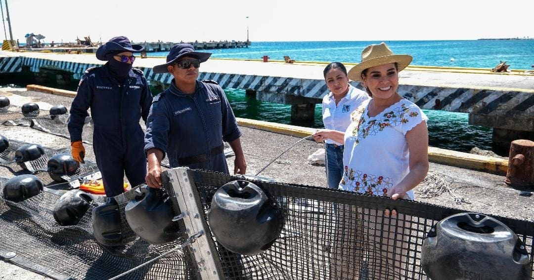 La gobernadora Mara Lezama Espinosa, el almirante Juan José Bernal Méndez, comandante de la Quinta Región Naval; y Blanca Merari Tziu Muñoz, presidenta municipal, iniciaron en Puerto Morelos los trabajos preventivos para la contención y recolección del sargazo durante la temporada de este año, en el que anunció que desde el Gobierno del Estado se impulsa la creación del Centro Integral de Saneamiento y Economía Circular del Sargazo.