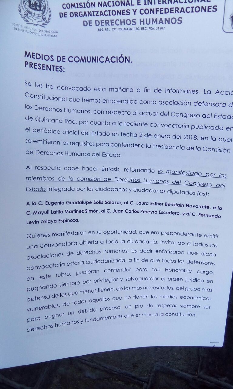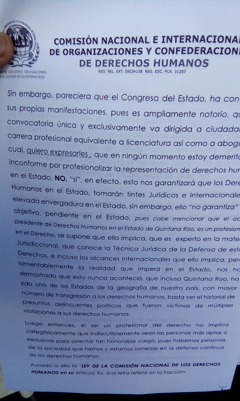 Cancún.- Raúl Fernández León, delegado de la Comisión Nacional e Internacional de Organizaciones y Confederaciones de Derechos Humanos AC, anunció que interpondrán un juicio de amparo en contra de la convocatoria para ocupar el cargo de presidente de la Comisión de Derechos Humanos del Estado de Quintana Roo (Cdheqroo), abierta únicamente a abogados.