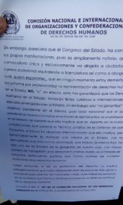 “La ley de la Comisión de Derechos Humanos no pide necesariamente un abogado”, expresó el activista. “Dice ‘preferentemente’, pero no dice que deba ser un abogado”.