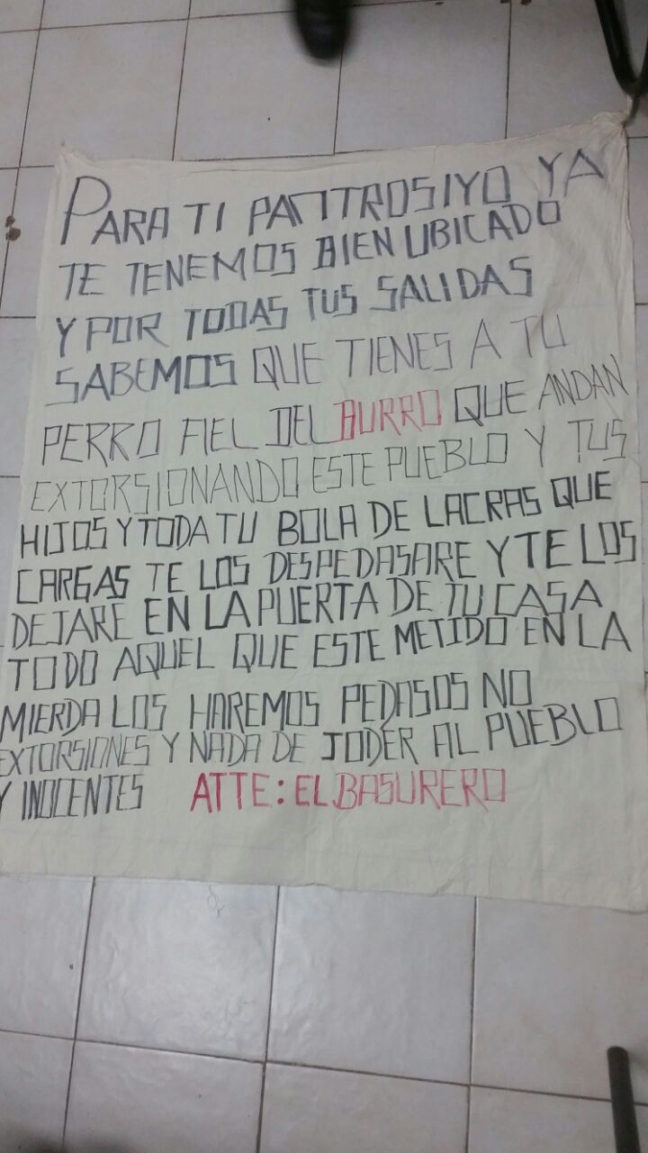 En el mensaje, dirigido a un tal “Patronsiyo” se apreciaba que ya los tienen ubicados y les reiteran que dejen de “extorsionar al pueblo” o lamentarán las consecuencias. Firma el mensaje “El Basurero”.