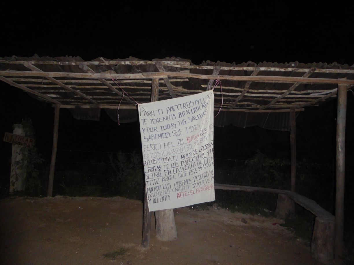Playa del Carmen.- Una narcomanta apareció esta madrugada en un puesto de láminas, en la invasión conocida como In House, la cual tenía un mensaje contra supuestos líderes a los que les decían que ya los tienen ubicados y les exigen que dejen de extorsionar al pueblo.