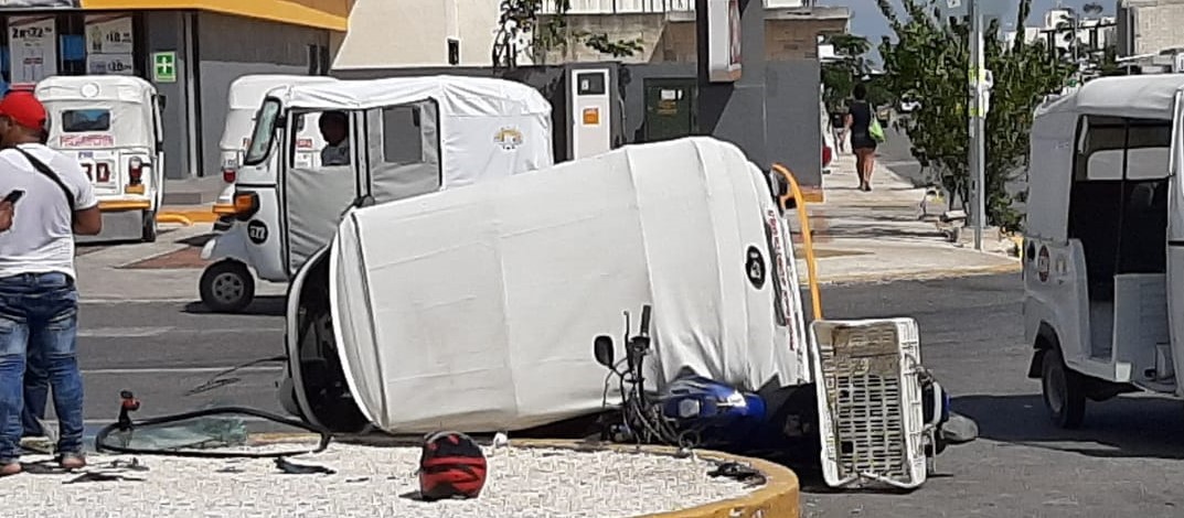 Playa del Carmen.- Un mototaxi se estrelló en contra de una motocicleta, sobre la que se volcó, esta tarde en el quinto parque de Villas del Sol.