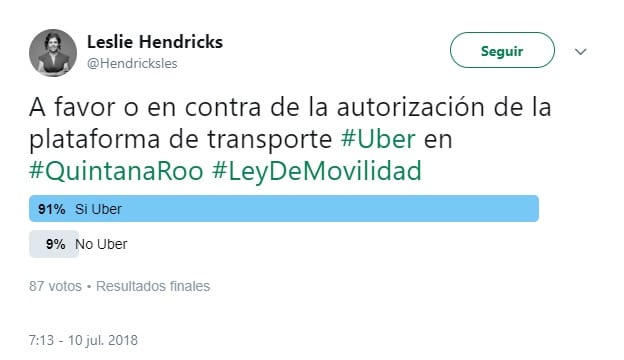 Días después de haber votado a favor de la modificación a la Ley de Movilidad, para limitar las plataformas de transporte a quienes cuenten con una concesión, la legisladora abrió una encuesta en su cuenta de Twitter y ahí, ante los planteamientos de ciudadanos, tuvo que definir una postura.