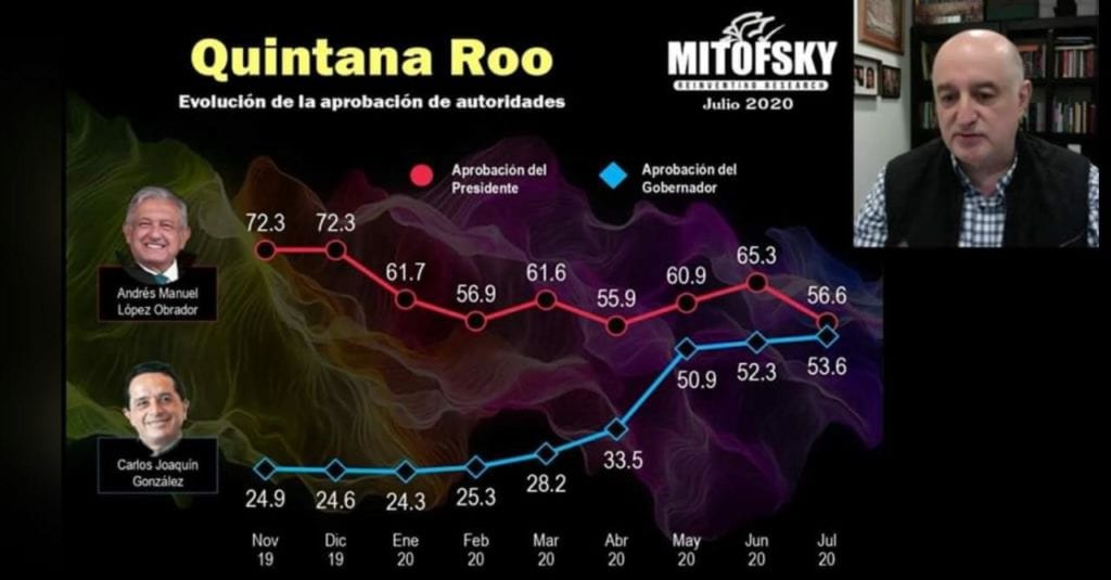 Roy Campos, Presidente de Consulta-Mitofsky, Actuarío y de Matemático por la UNAM, explicó que con la pandemia han cambiado muchas cosas, como las aprobaciones de los ciudadanos en torno a los políticos y específicamente con los gobernadores, de los cuales unos han destacado más que otros y uno de los que ha subido es Carlos Joaquín González en Quintana Roo, sobre todo entre abril y mayo, “cuando se puso a defender a los hoteleros, al sector turístico, que es prácticamente donde vive su principal ciudad, que es Cancún con su cabecera Benito Juárez”.