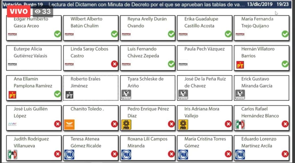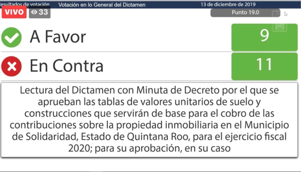 El dictamen con minuta de Decreto por el que se aprueba el Presupuesto de Egresos del Gobierno del Estado de Quintana Roo, para el Ejercicio Fiscal 2020, fue aprobado en lo general y en lo particular con 17 votos a favor y 2 en contra de los diputados Hernán Villatoro Barrios, del grupo legislativo del PT y Alberto Batún Chulim, del grupo legislativo de MORENA.