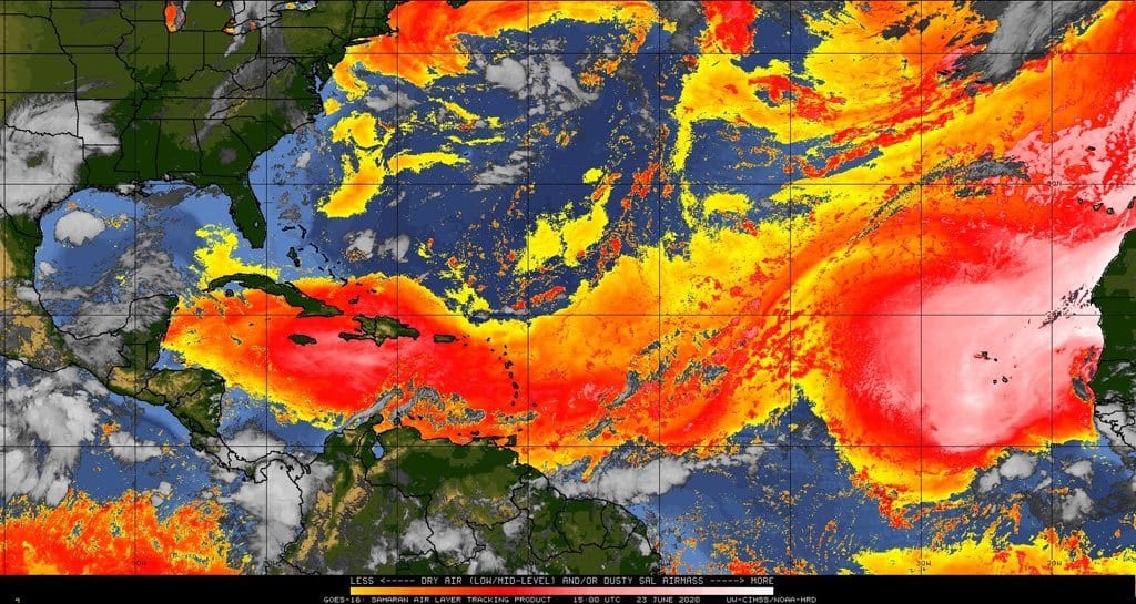 Dicho fenómeno meteorológico transporta partículas de polvo desde zonas desérticas del norte de África, mismas que han viajado miles de kilómetros sobre el océano Atlántico, empujados por los vientos de verano.