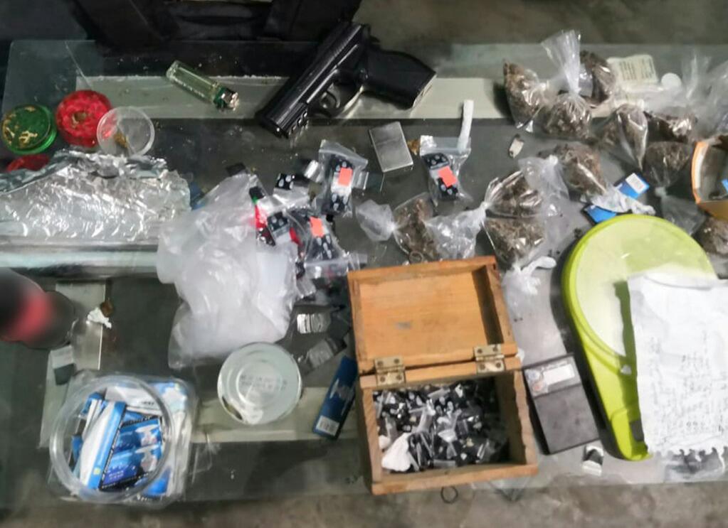 Lo asegurado fue: diversas drogas, objetos probablemente utilizados para la distribución del estupefaciente, una réplica de arma corta, un chaleco táctico y varios equipos celulares.