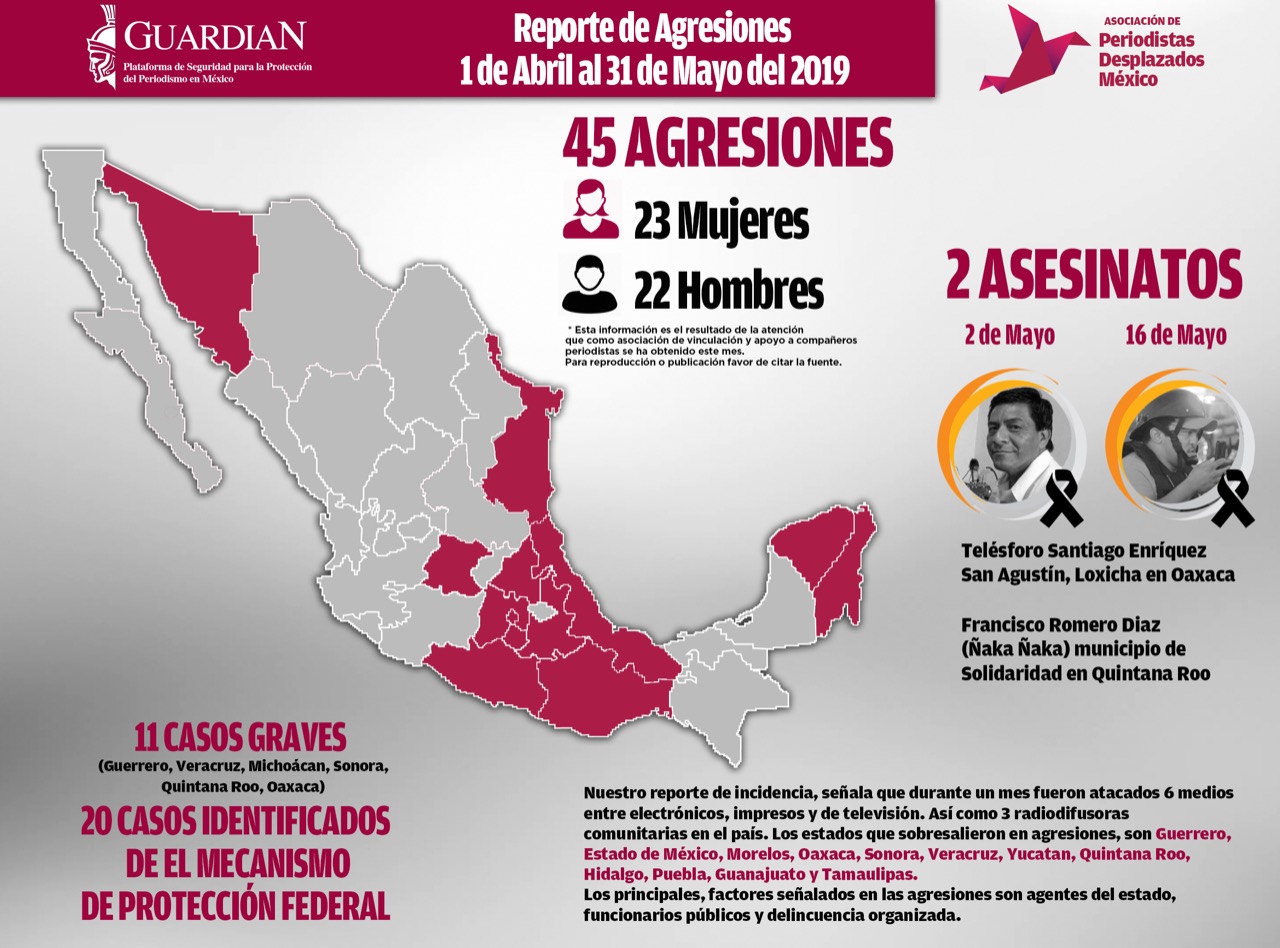 En el mes de mayo, la Asociación de Periodistas Desplazados registró dos asesinatos más de periodistas con los que se alcanzan los 10 en el primer semestre de este 2019, y nuevo gobierno; se trata Telésforo Santiago Enriquez, de Oaxaca, y Francisco Romero Díaz, en Quintana Roo.