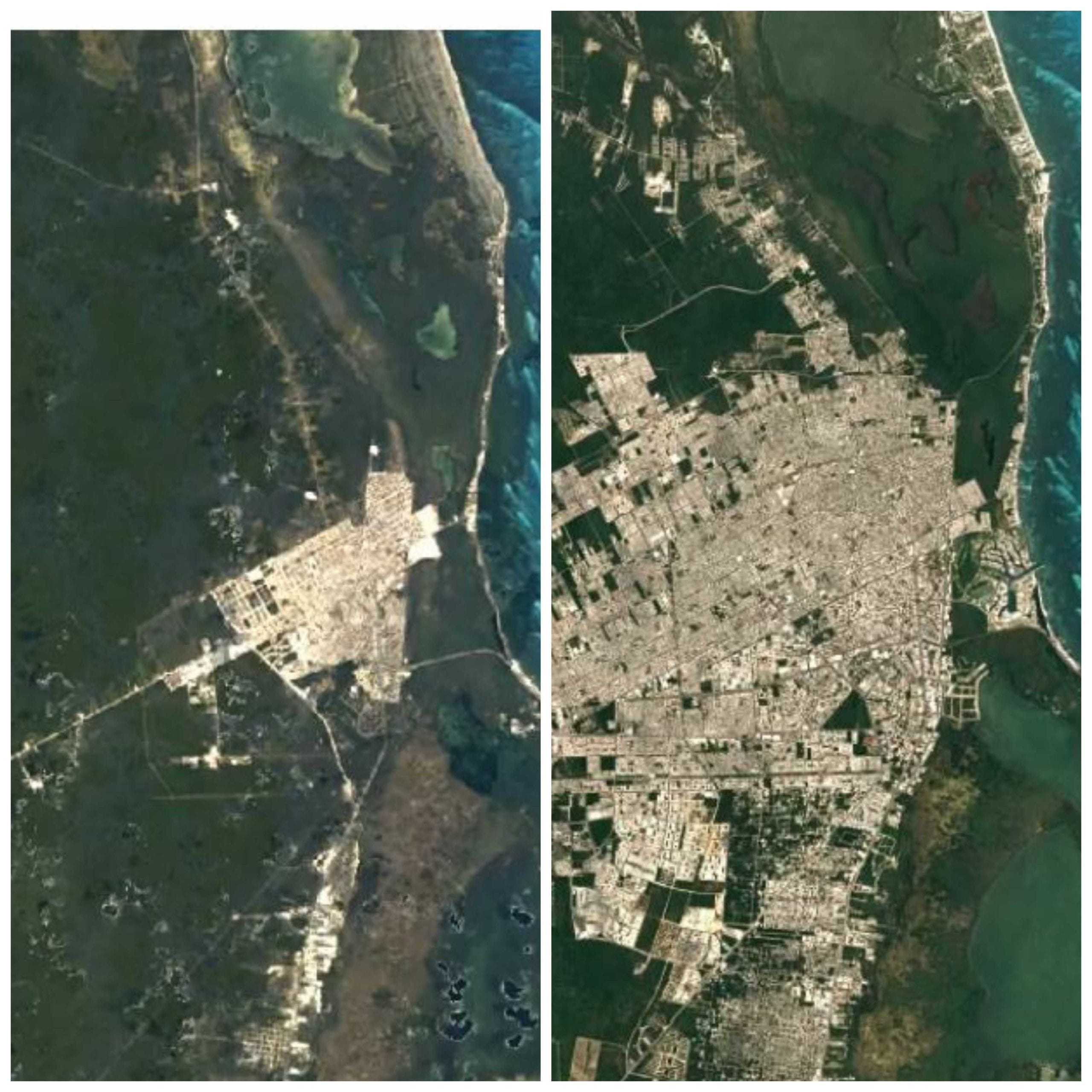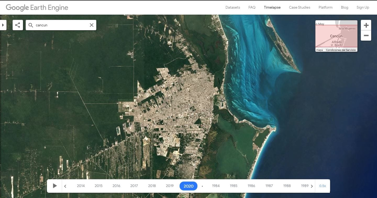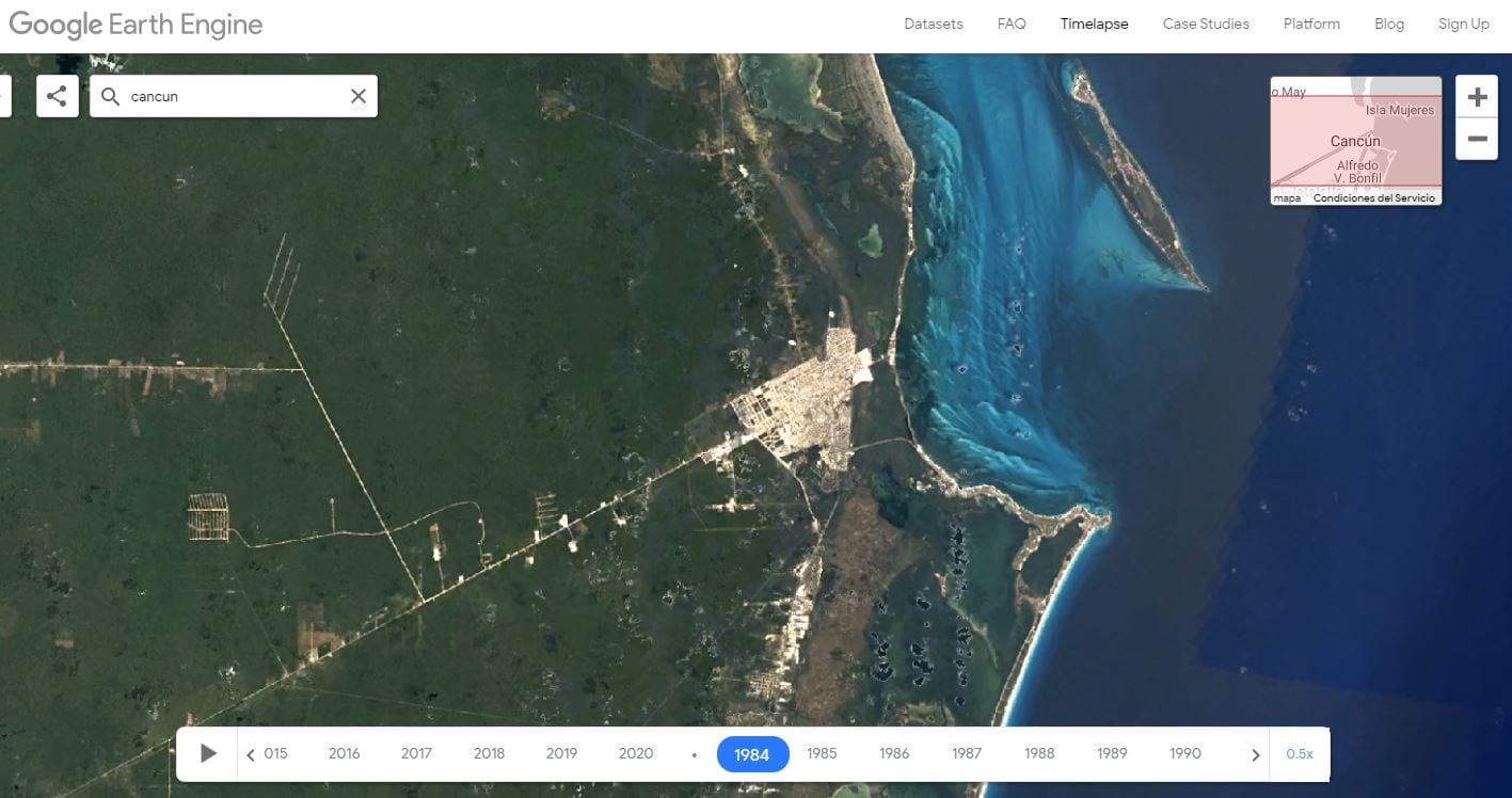 El video de la evolución abarca desde el año de 1984 hasta 2018. A primera vista es posible observar el aumento de la mancha urbana en el estado de Quintana Roo, específicamente el paraíso mexicano: Cancún, ubicado en el municipio de Benito Juárez.