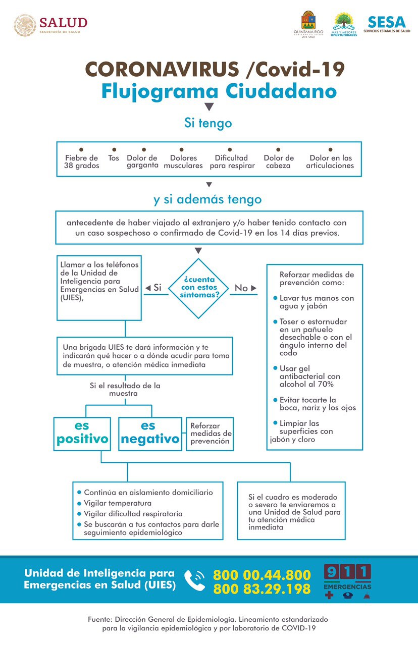 Junto al texto “Amigas y amigos les presento el Flujograma Ciudadano del #COVID_19. Una herramienta que todo quintanarroense debe tener a la mano para ayudarnos a identificar casos oportunamente, evitar contagios y pedir ayuda,” el gobernador compartió el siguiente Flujograma Ciudadano.
