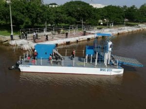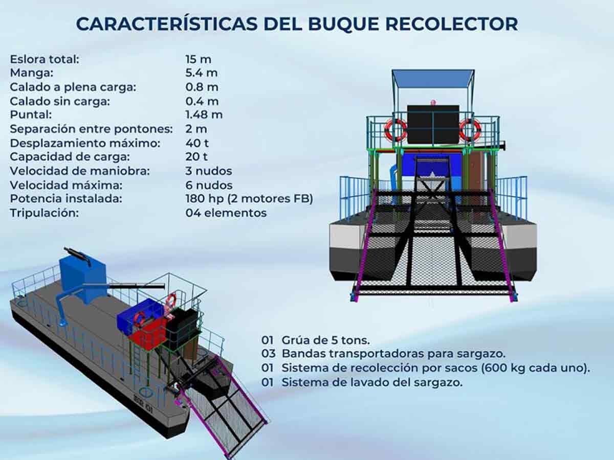 Su tripulación será de cuatro elementos con el que se atenderá el control de la embarcación, así como una grúa de 5 toneladas, tres bandas transportadoras del sargazo, un sistema de recolección por sacos, cada uno de 600 kilos, y un sistema de lavado del alga.