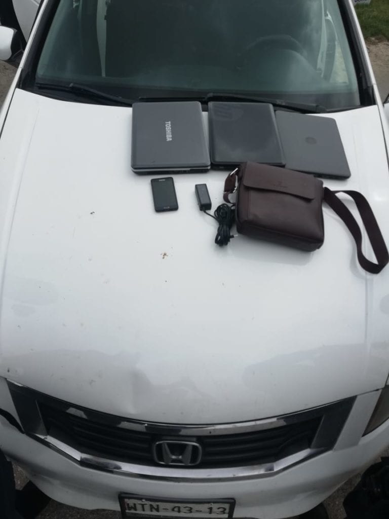 Benito F.L. de 37 años de edad, Irvin E.J.R. de 20 años de edad y Arturo R.S. de 39 años, todos originarios de Tabasco, iban a bordo de un automóvil Honda Accord blanco, con placas de ese estado, en posesión de tres computadoras laptop, así como un celular, un bolso y otras pertenencias.